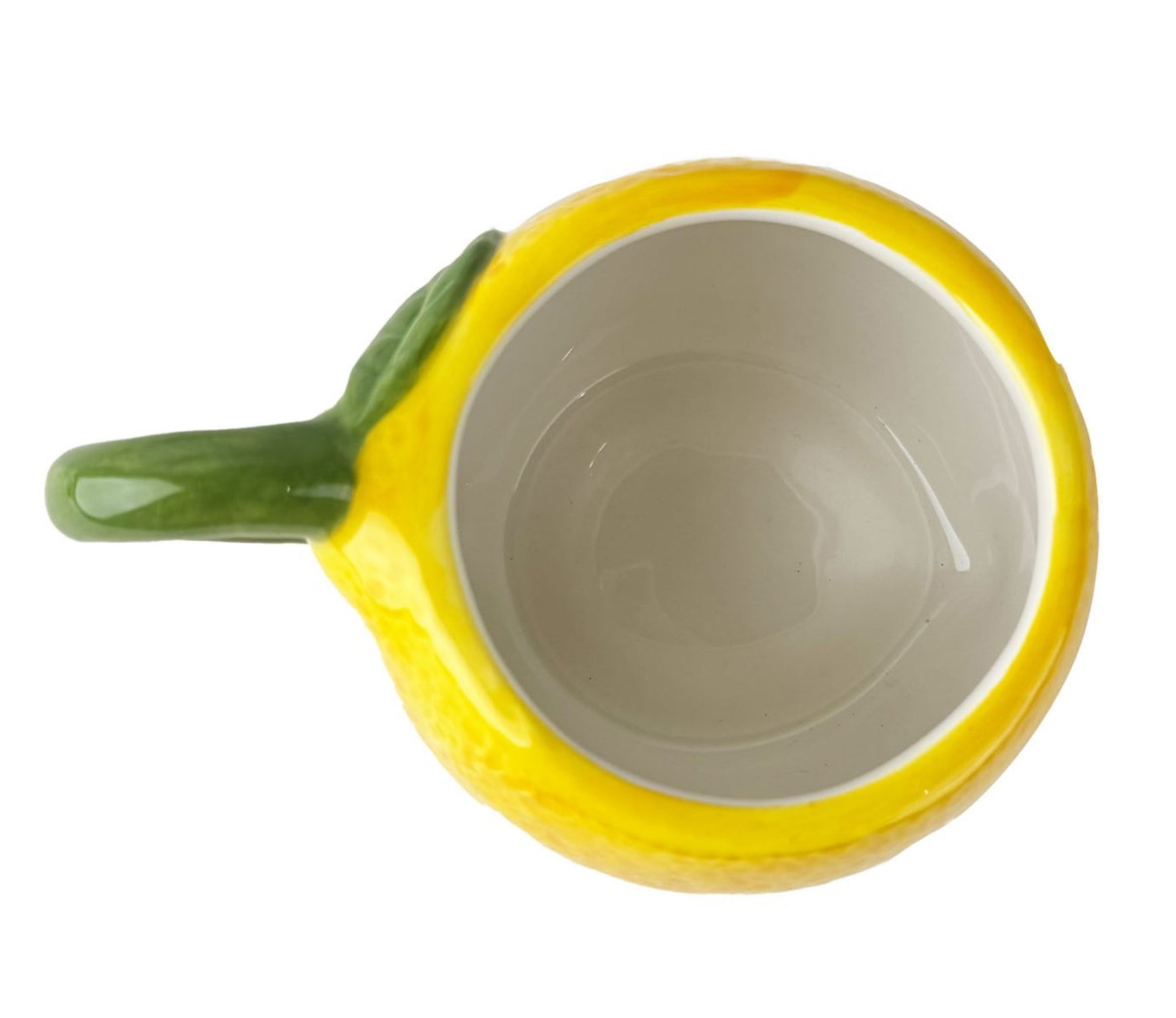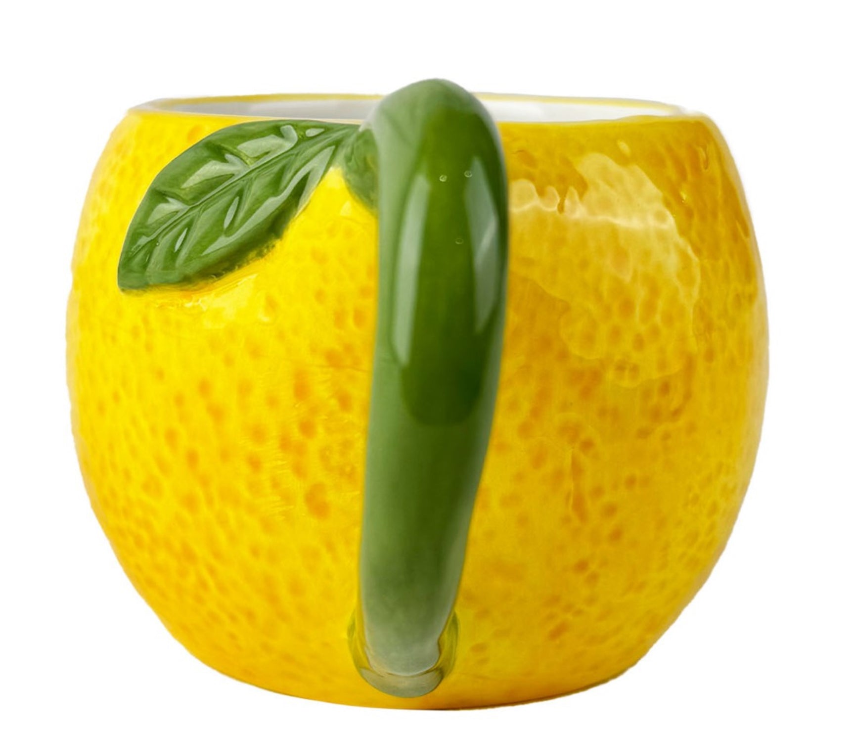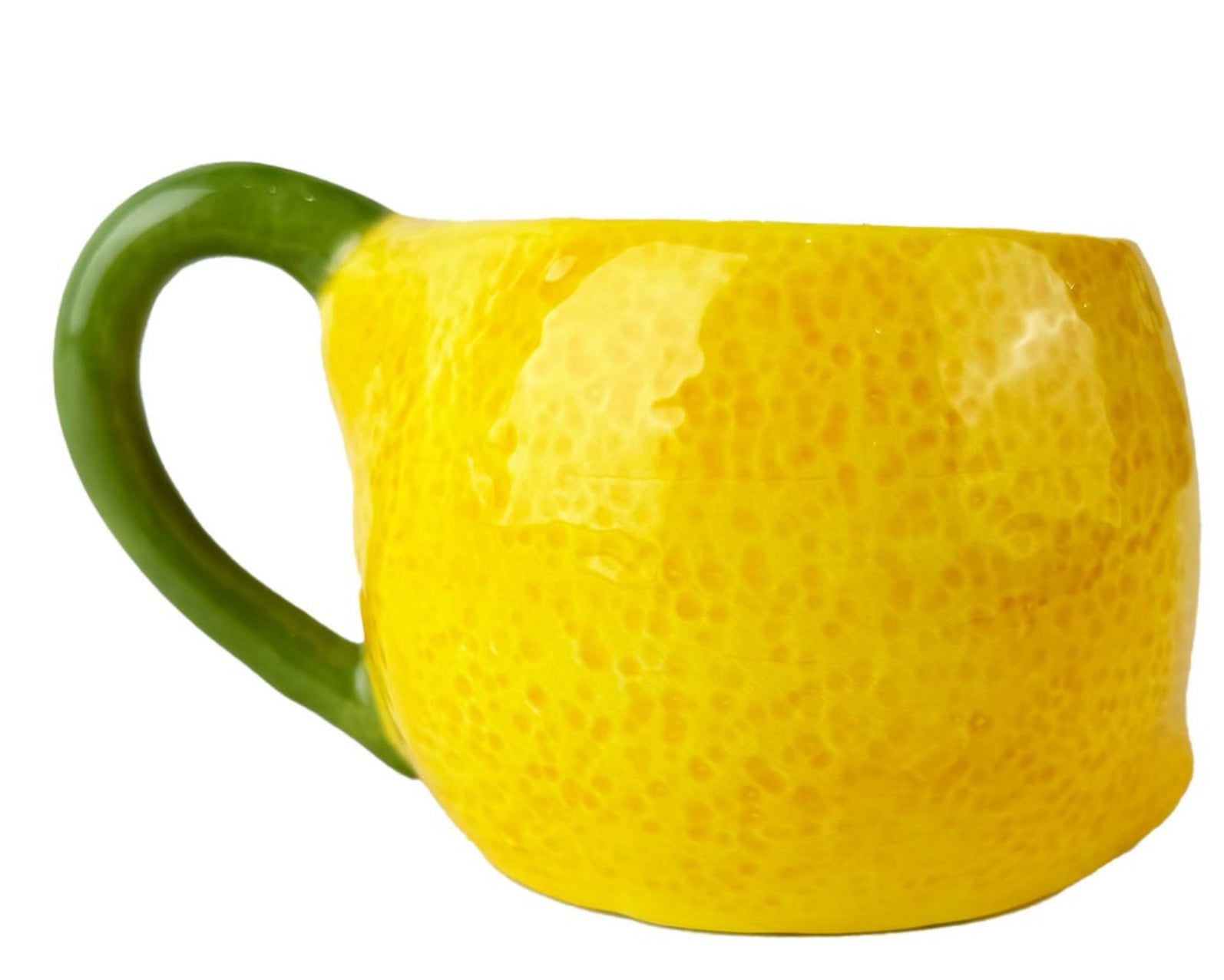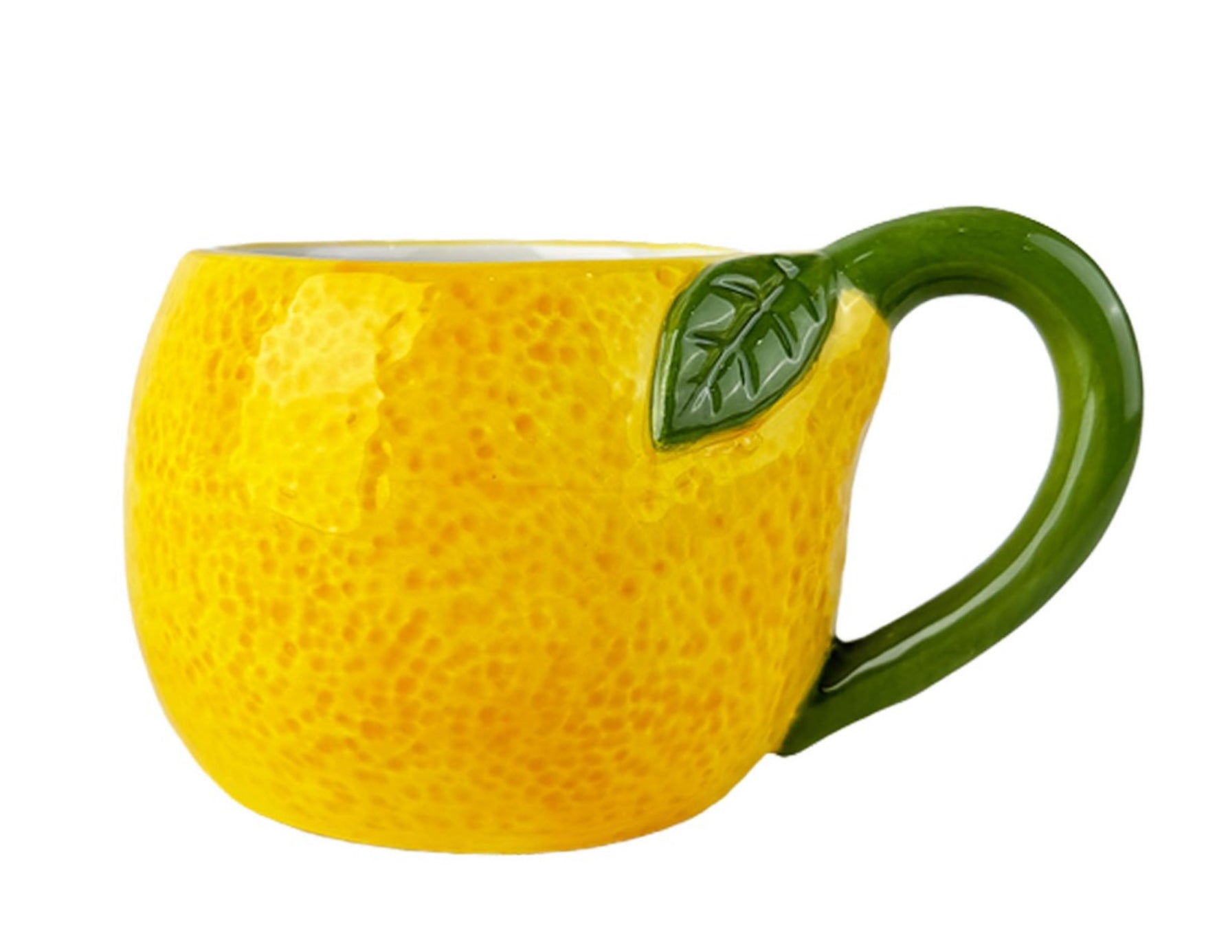 Taza de cerámica pintada a mano con relieve de limón. Ideal para darle un toque de color a tu mesa.