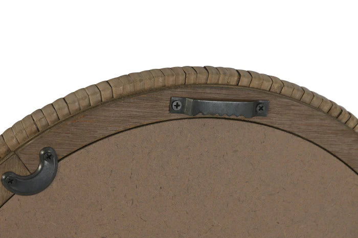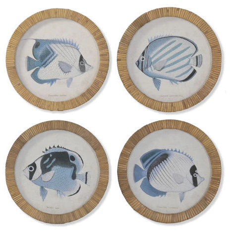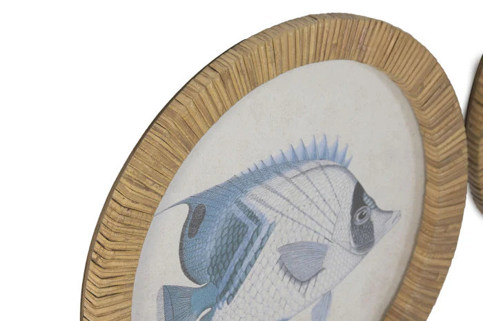 Colección de cuatro cuadros circulares con peces en tonos azul y blanco. Enmarcados en ratán y con crital.