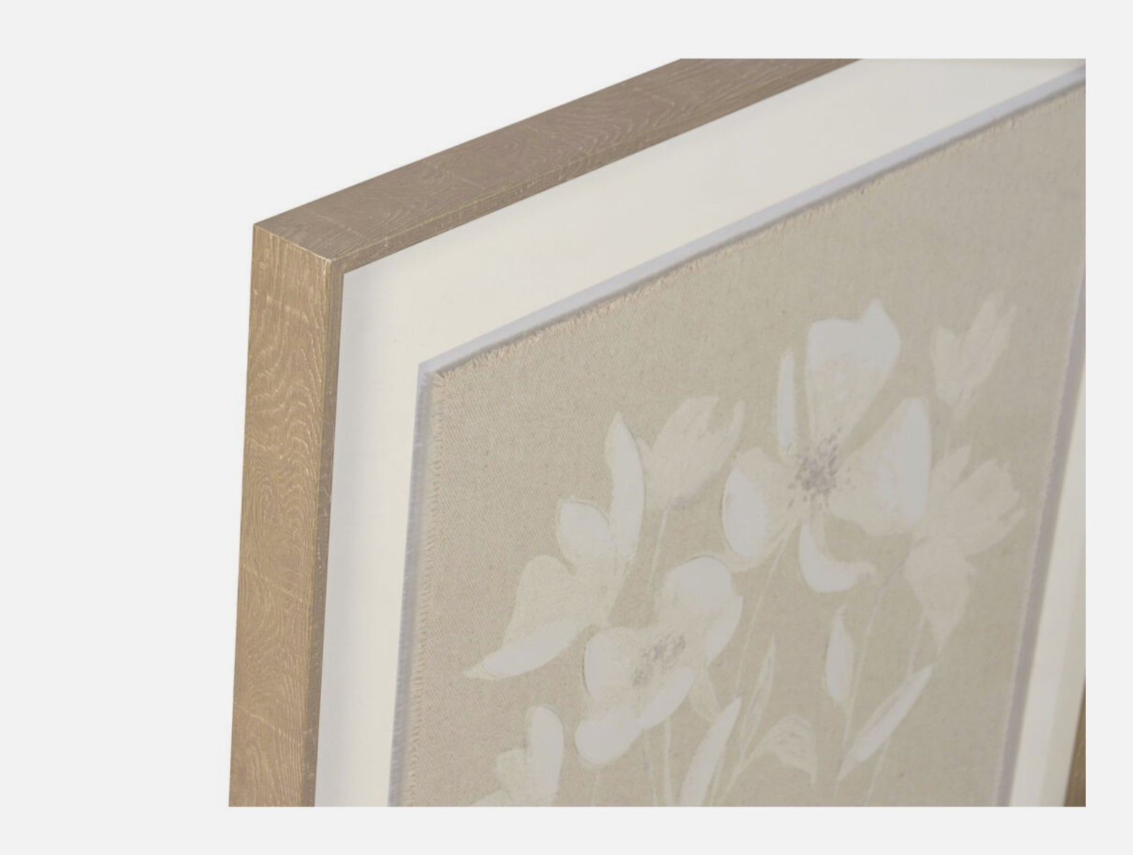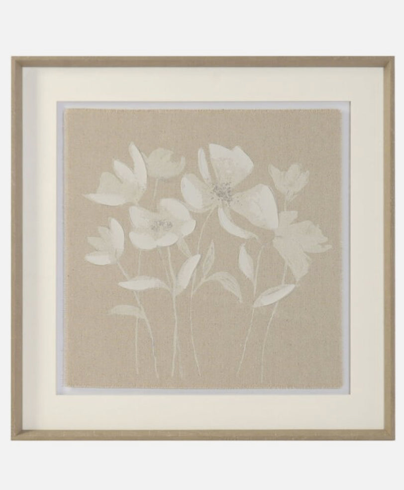 Cuadro con lámina de flores sobre fondo color crudo bajo cristal.