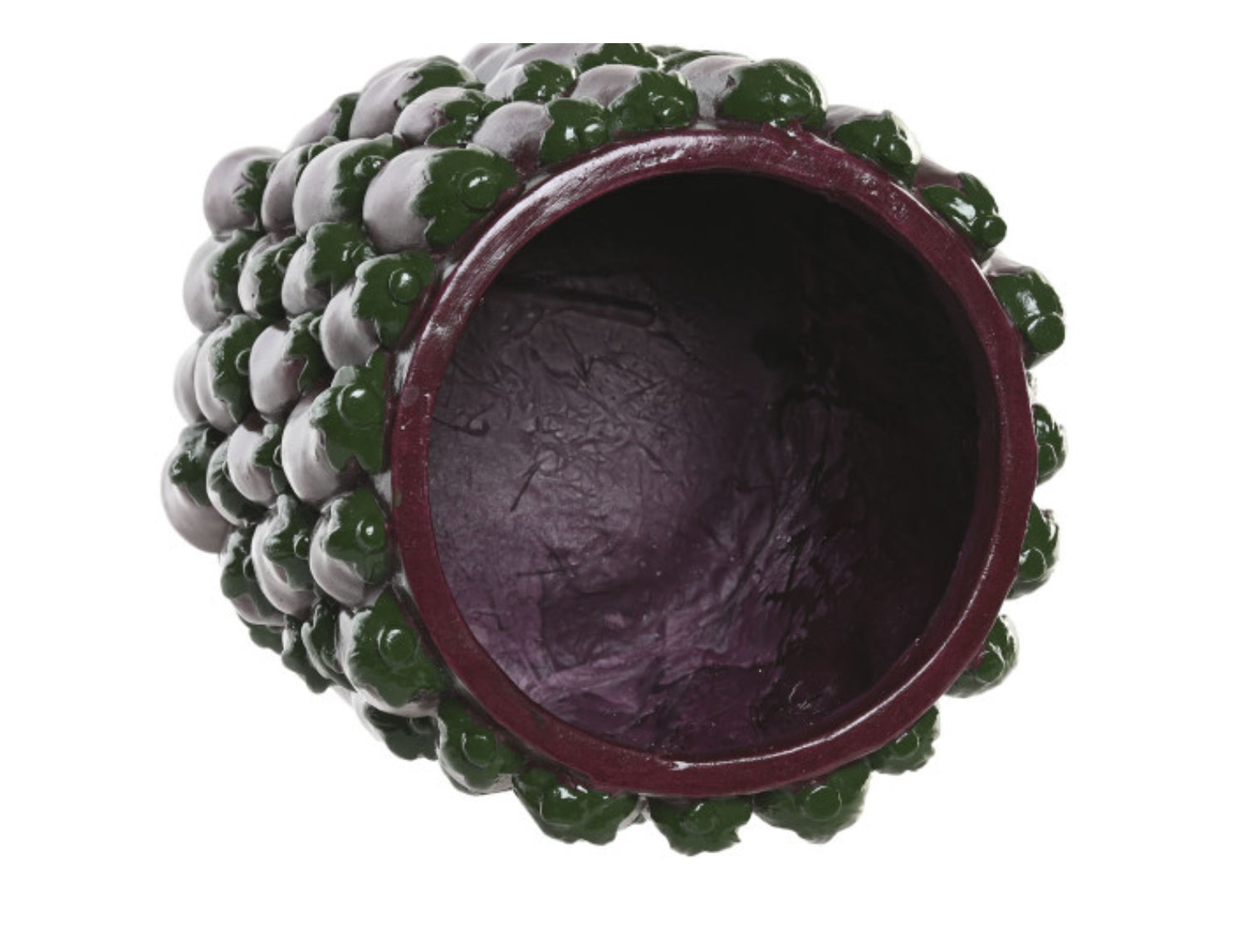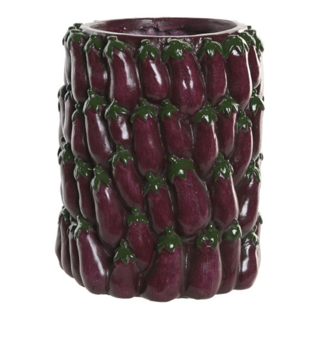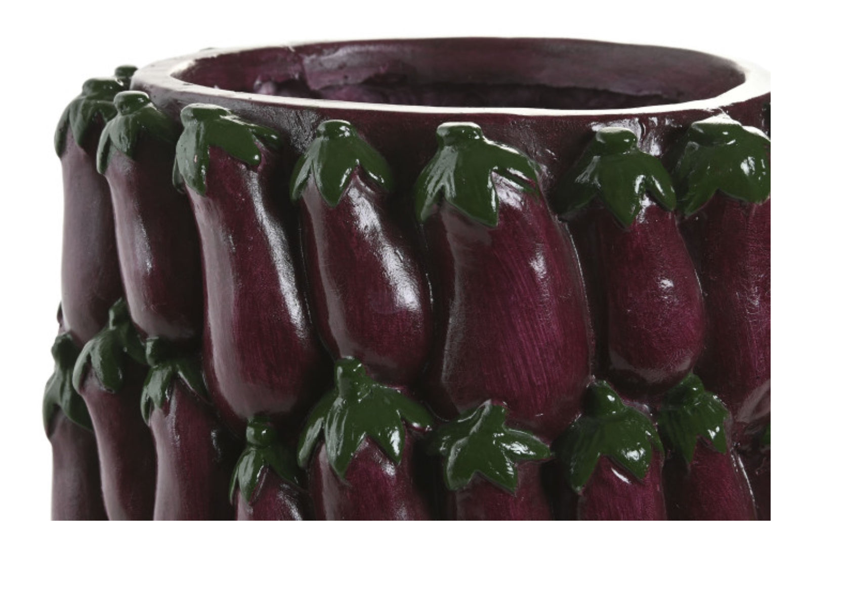 Jarrón redondo con diseño de berenjena hecho de magnesia.