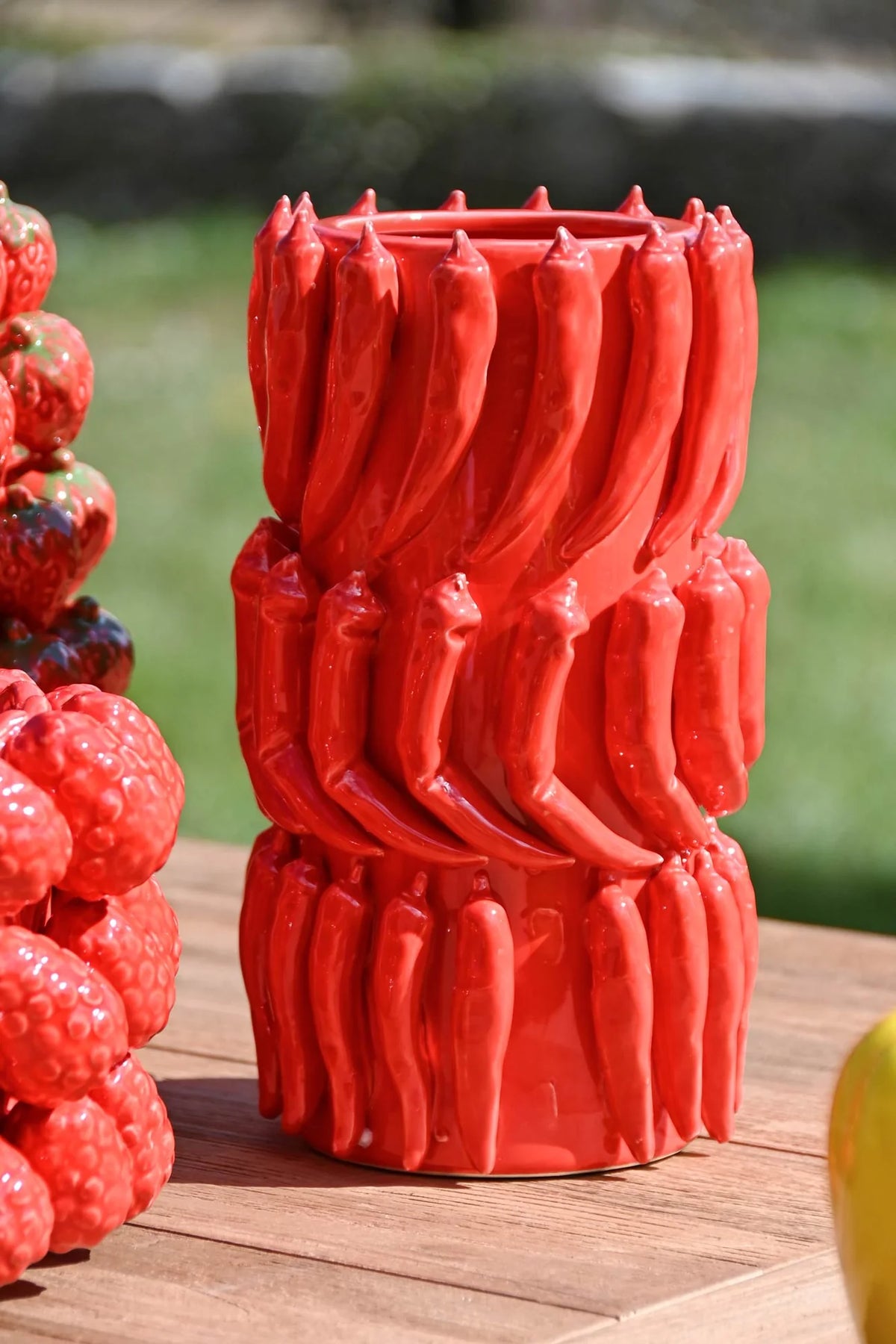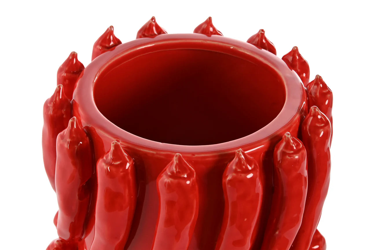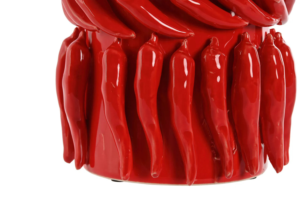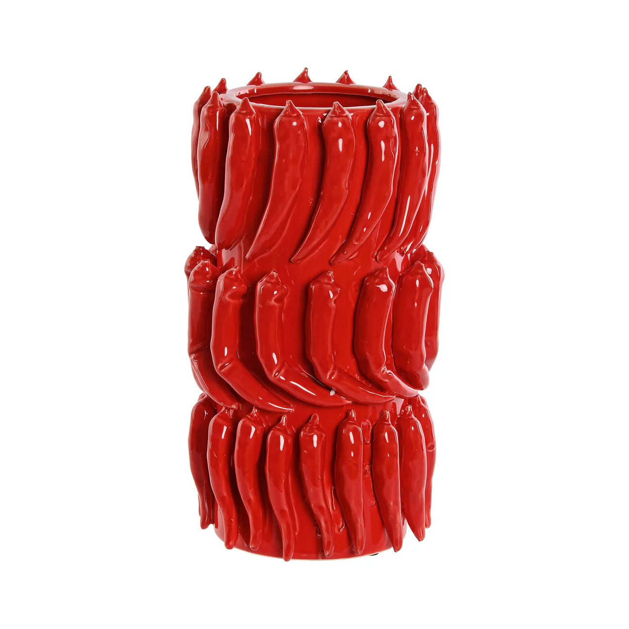 Si te gusta rodearte de objetos con personalidad, este jarrón decorativo de cerámica roja con diseño de guindillas será tu nuevo flechazo. Con su estética atrevida, forma cilíndrica y su vibrante acabado esmaltado en rojo fuego, este jarrón es todo menos discreto. Es una pieza que enciende cualquier estancia con su originalidad.
