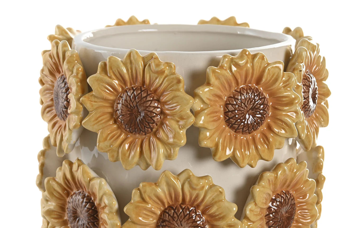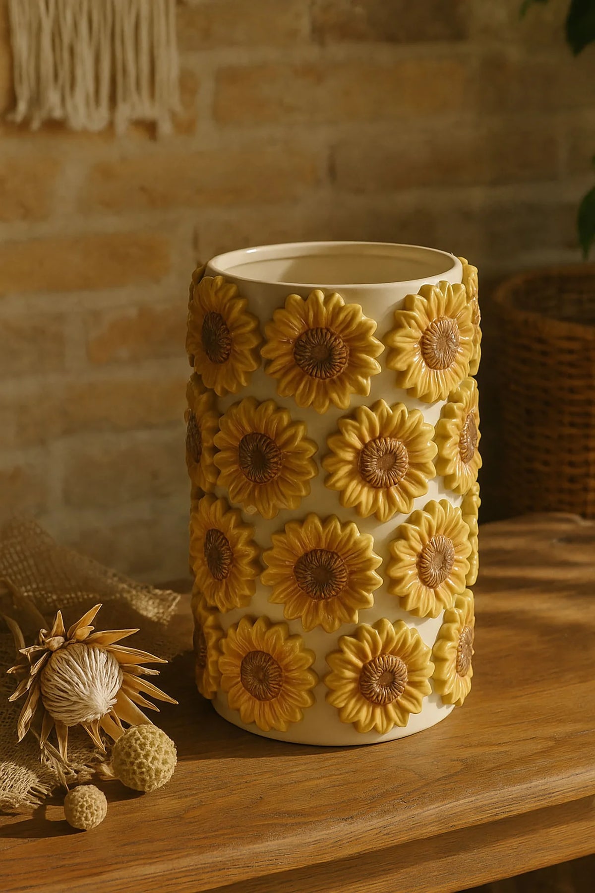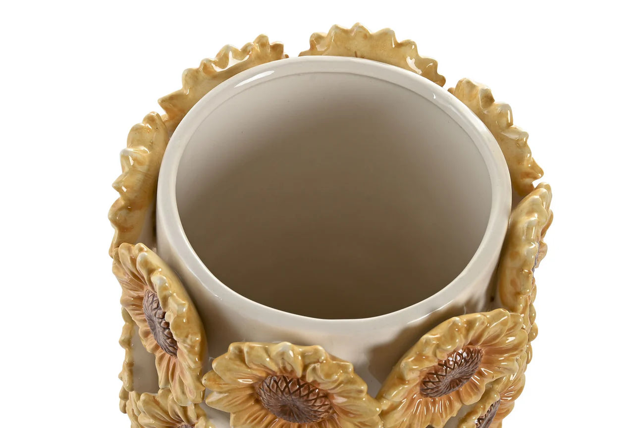 El jarrón de cerámica con girasoles en relieve es una oda al color, la alegría y la naturaleza mediterránea. Su diseño en tono neutro se enriquece con la explosión dorada de los girasoles modelados en relieve, creando una pieza que transmite calidez y vitalidad en cualquier espacio.