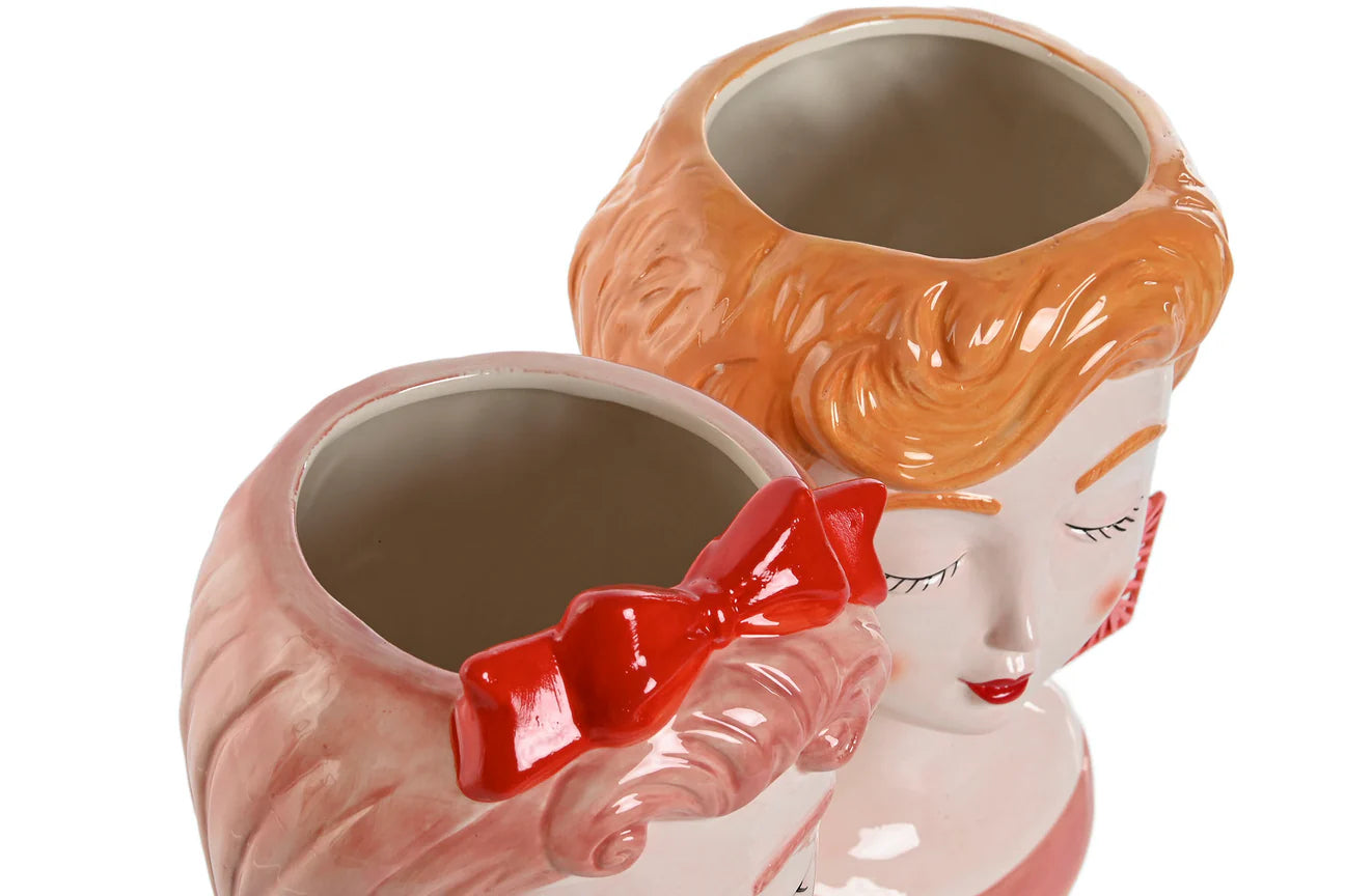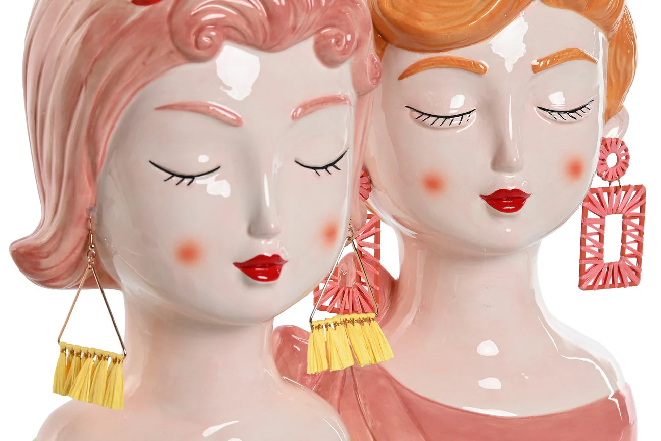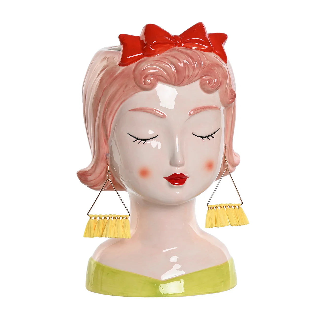 Jarrón de cabeza de chica con pendientes amarillos hecho de cerámica.