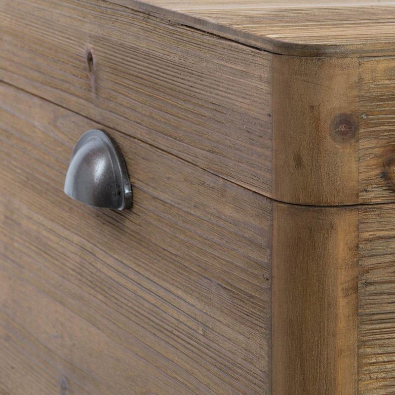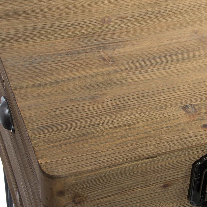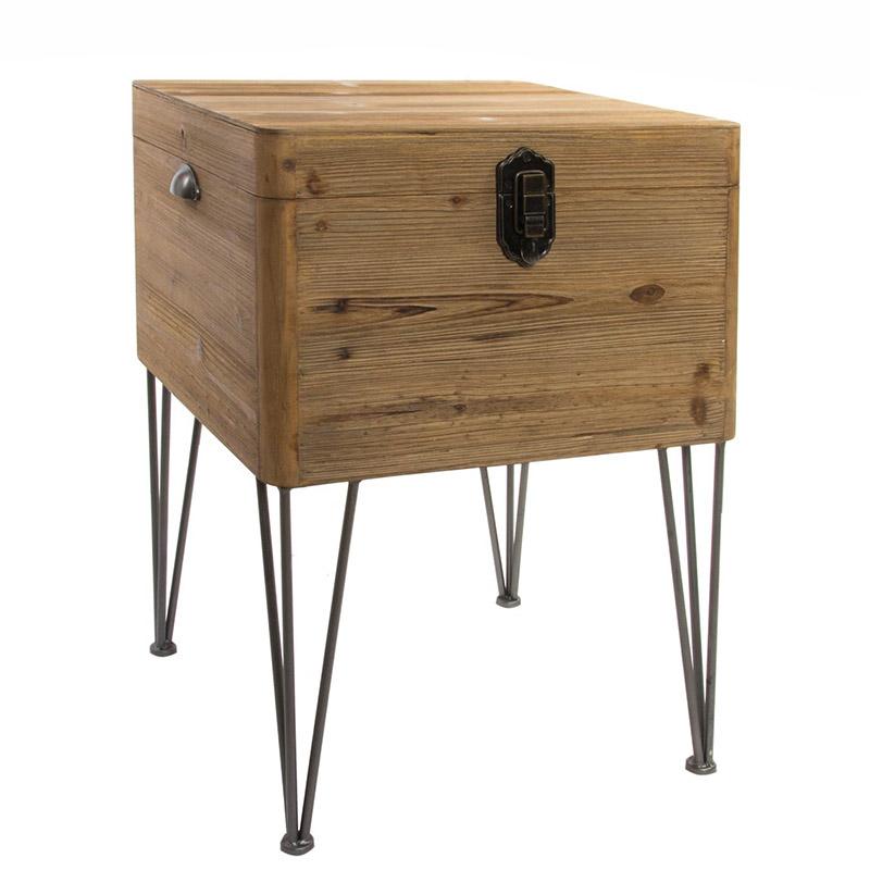 Mesa auxiliar tipo Baúl, con capacidad para almacenaje en su interior realizada en madera natural con patas en metal color negro.